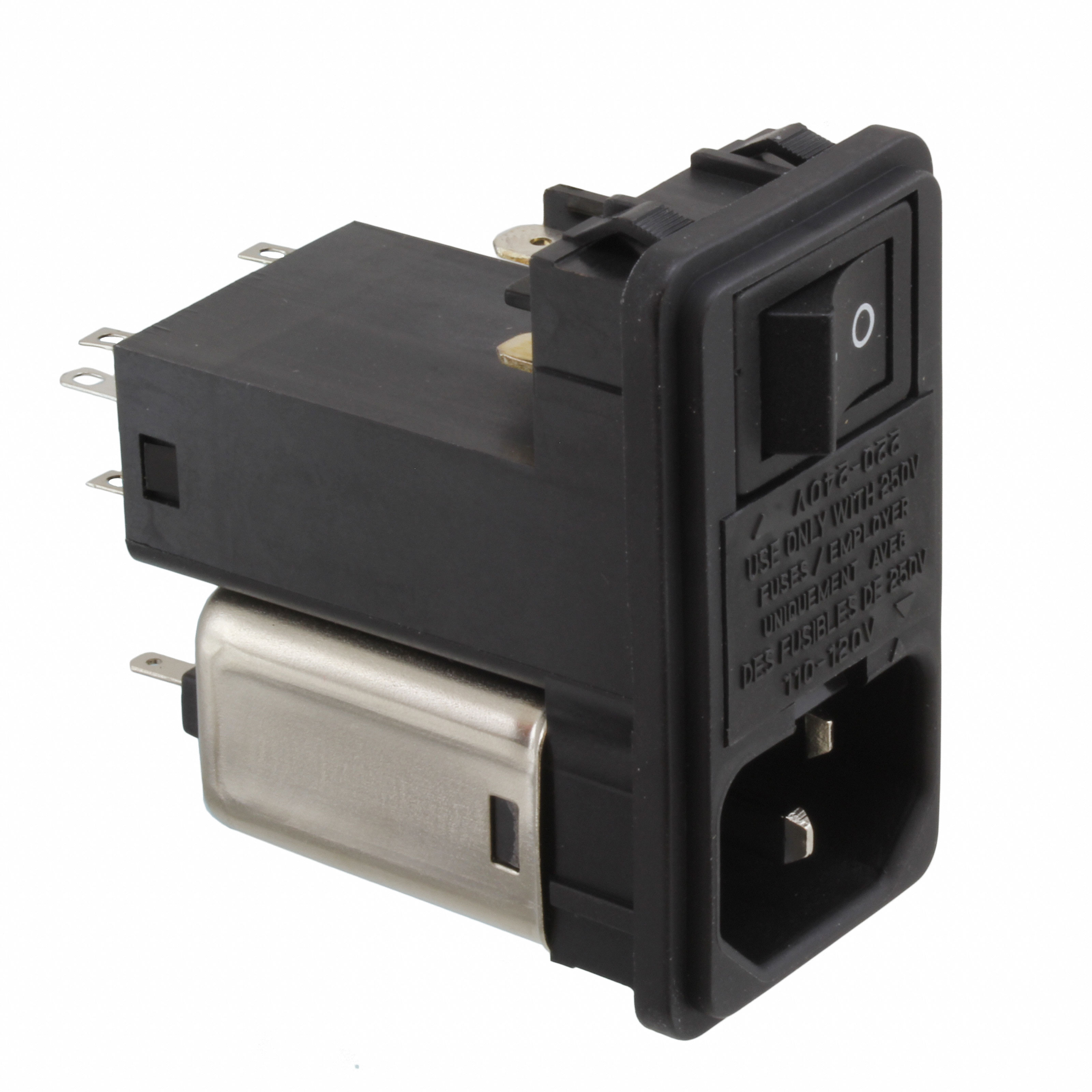 Yksityiskohtainen kuvaus Power Entry Connector Receptacle, Male Blades - Module IEC 320-C14 Panel Mount, Snap-In Nykyinen - UL -